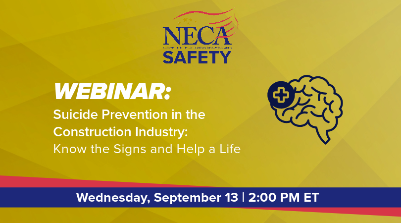 Join NECA, CPWR, MCAA, SMACNA and TAUC for a crucial webinar on Suicide Prevention in the Construction Industry. We will be joined on this webinar by a representative from NASCAR driver Daniel Dye’s race team and the Race to Stop Suicide for a conversation about real issues affecting us every day and ways to spot signs of depression. You can register below and submit questions in advance.